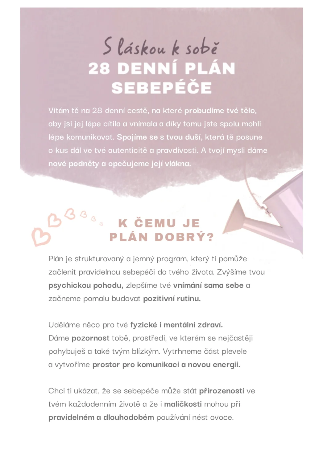 „Představ si, že přesně víš, CO, KDY a PROČ máš dělat. Nemusíš nad ničím přemýšlet. Vše je připraveno – stačí jen následovat kroky a postupně si vytvářet návyk, který ti přináší radost, klid a pocit naplnění. Sebepéče se stane přirozenou součástí tvého života a s každým dalším dnem se budeš cítit víc propojená sama se sebou. Tento plán není jen krátkodobou pomocí, ale skutečnou cestou k dlouhodobé pohodě a osobnímu růstu. Pravidelnost přináší výsledky, dlouhodobost mění život.”