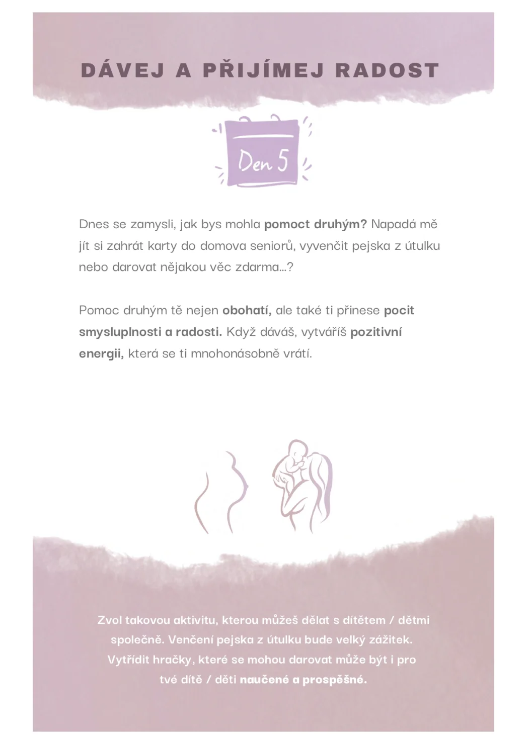 • 28 dní plných péče o sebe, své tělo, mysl i duši: Zaměříš svou pozornost na každou část sebe – tělo, mysl a duši a najdeš rovnováhu a klid.