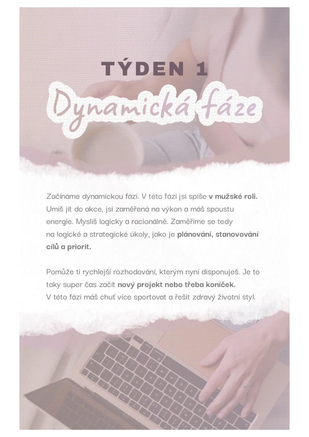 • 4 týdny napojené na tvůj ženský cyklus: Plán respektuje rytmus tvého těla a cyklu, takže se naučíš pracovat a lépe chápat a přijímat své tělo, potřeby a nálady.